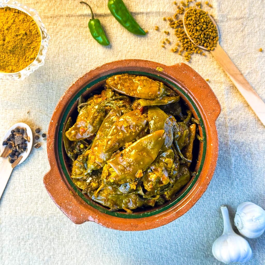 Add a bold punch to your meals with our Hari Mirch Pickle, made using fresh green chilies handpicked from local farms. Each chili is carefully slit and filled with a traditional mix of Shikarpuri spices, then preserved in pure mustard oil to lock in its natural heat and aroma.