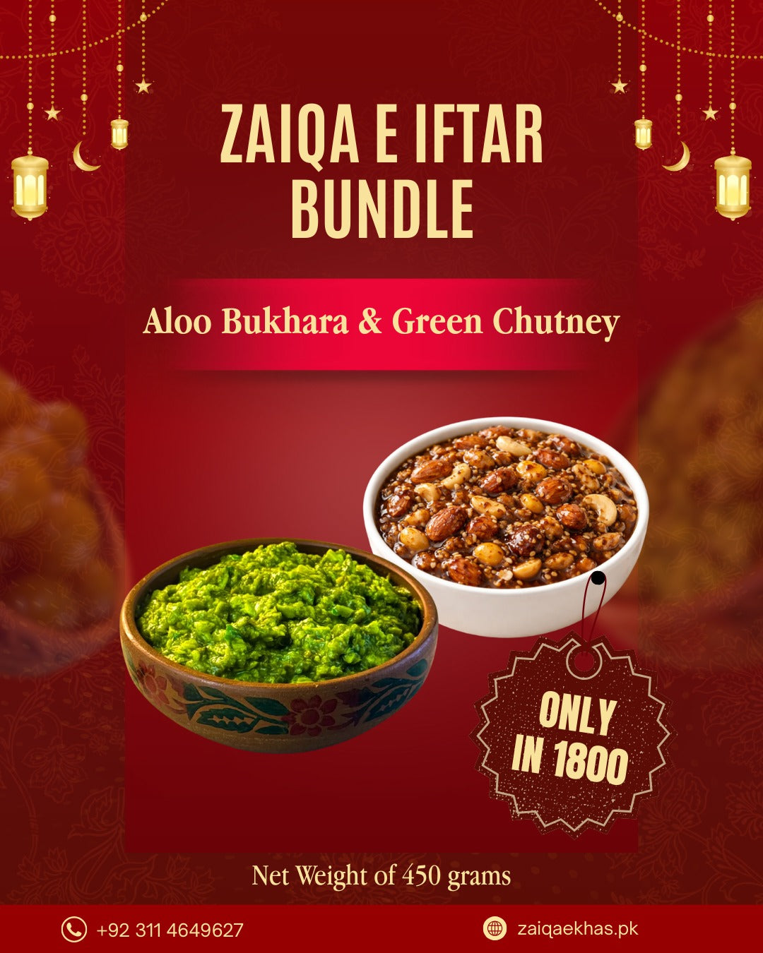 After a day of fasting, the first bite of Iftar should be a burst of flavor. The Zaiqa-e-Iftar Bundle focuses on enhancing the joy of your evening meal. While the Aloo Bukhara Chutney adds a touch of sweetness and luxury, the Green Chutney ensures your meal feels light and refreshing. It’s the "Secret Ingredient" that will have everyone at the Dastarkhwan asking for more!